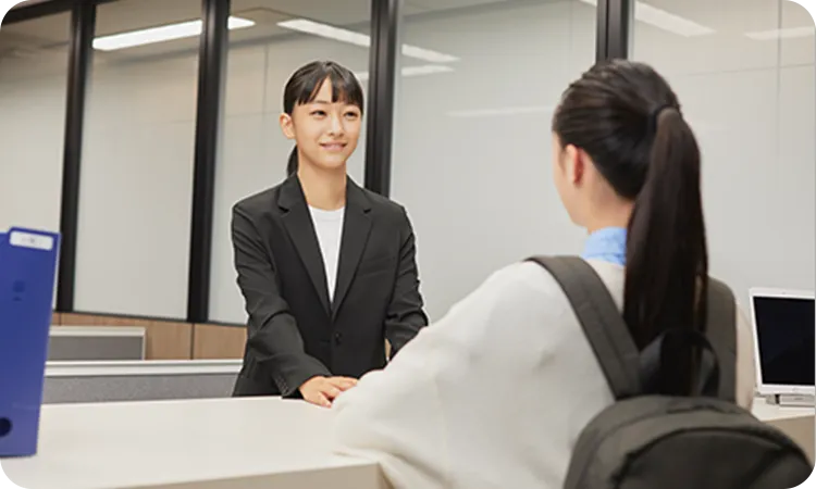 校舎に到着すると、受付のスタッフが明るく出迎えます。