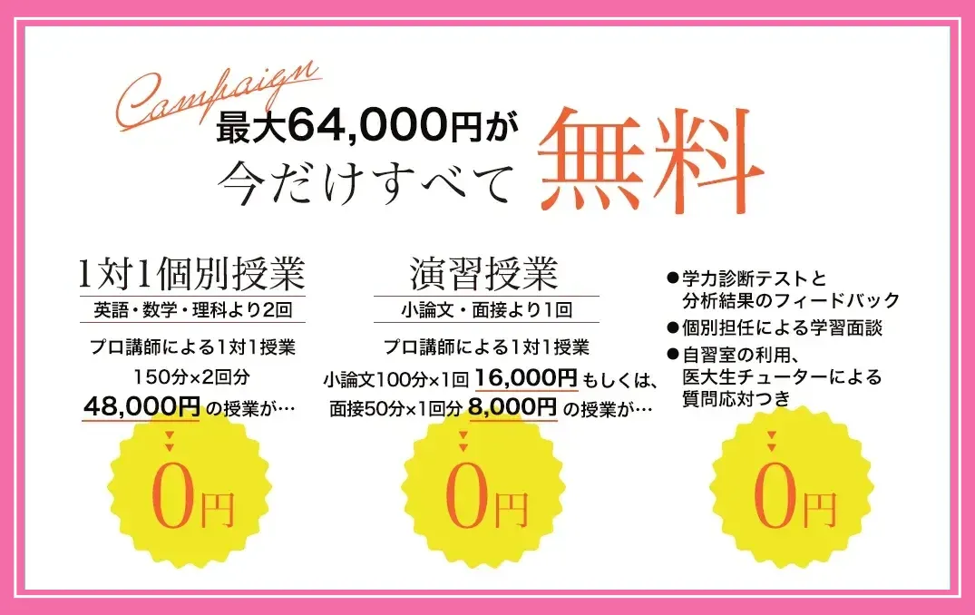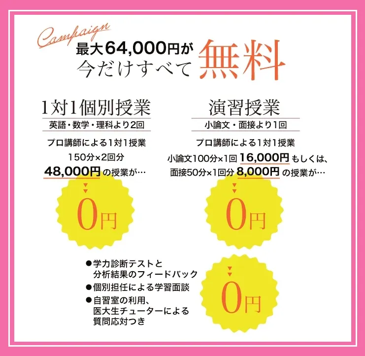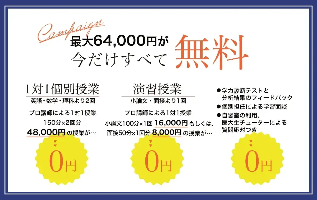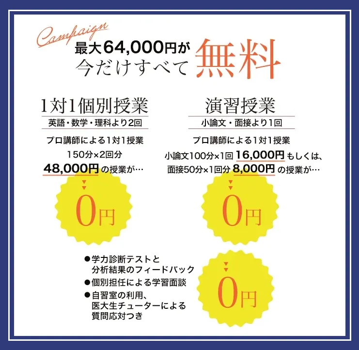 | 対象科目 | 英語・数学・理科(化学・生物・物理)より2回、および演習授業(小論文もしくは面接)1回を無料受講 |