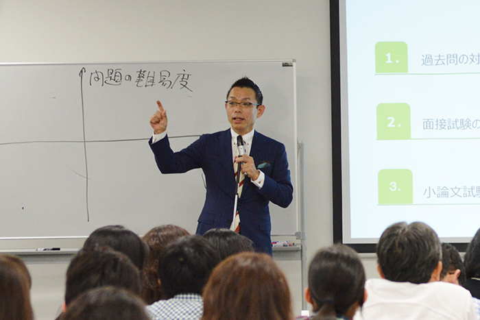 国公立大、私立大の難易度別にいくつかのグループに分け、その特徴が説明されました。また、個別授業ならではの受験校決定のための「マッチング指導」による対策は、参加者の支持を得たようでした。直前期の学習対策としては、過去問演習や面接・小論文試験対策もおろそかにしてはいけないことが強調されました。
